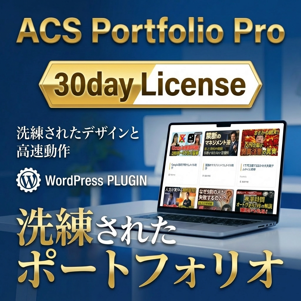 ACS Portfolio Proライセンスキー/365日 2026-01-25 / サイト管理者 ¥4,980 ACS Portfolio Pro 有料プランのライセンスキー【365日】 購入すると即時ライセンスキーが発行されます。 購入完了画面にキーが表示されるのでコピーしてご利用ください。 ライセンスキーの認証方法 ・ポートフォリオ項目の「ライセンス🔑」クリック ・購入したキーをペースト ・「保存」をクリック ・「同意」にチェックを入れて「ライセンスを有効化」をクリック ACS Portfolio Proライセンスキー/365日個 お買い物カゴに追加 カテゴリー: ライセンスキー タグ: ACS, ACS Portfolio Pro, ライセンスキー ブランド: ACS 関連商品 ACS Portfolio Proライセンスキー/30日 ¥980 お買い物カゴに追加 ACS Portfolio Proライセンスキー/1日 ¥100 お買い物カゴに追加 ACS Article generatorライセンスキー/365日 ¥14,800 お買い物カゴに追加 ACS Business Calendarライセンスキー/1日 ¥100 お買い物カゴに追加 🚀 WordPress制作をプロに任せませんか? Locanyなら一般的な制作会社の1/3の価格・1/2の納期で高品質なサイトを制作します LP・小規模:3万円〜 集客サイト:15万円〜 大規模・EC:30万円〜 制作サービス詳細 → LINEで見積もり相談 Share This Post